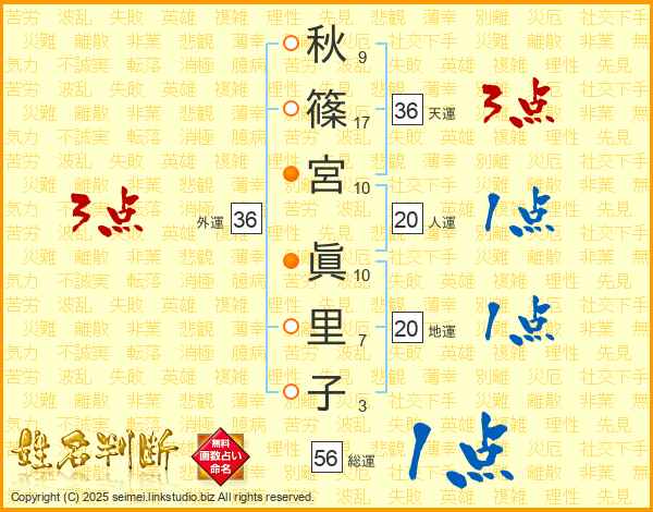 秋(9画)篠(17画)宮(10画) 眞(10画)里(7画)子(3画)