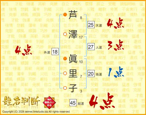 芦(8画)澤(17画) 眞(10画)里(7画)子(3画)