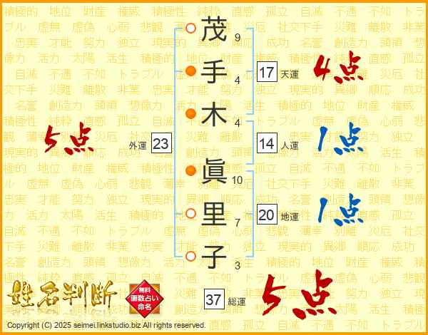 茂(9画)手(4画)木(4画) 眞(10画)里(7画)子(3画)