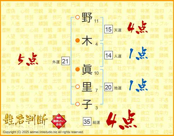野(11画)木(4画) 眞(10画)里(7画)子(3画)