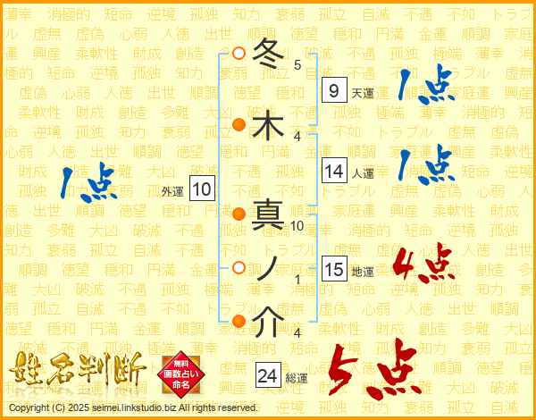 冬(5画)木(4画) 真(10画)ノ(1画)介(4画)