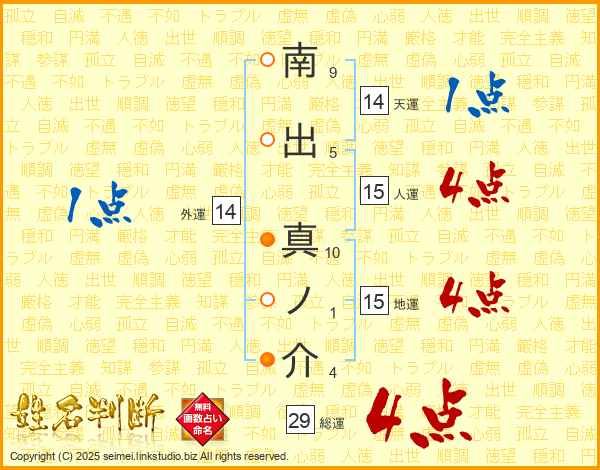 南(9画)出(5画) 真(10画)ノ(1画)介(4画)