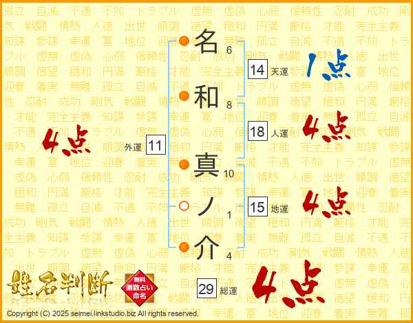 名(6画)和(8画) 真(10画)ノ(1画)介(4画)