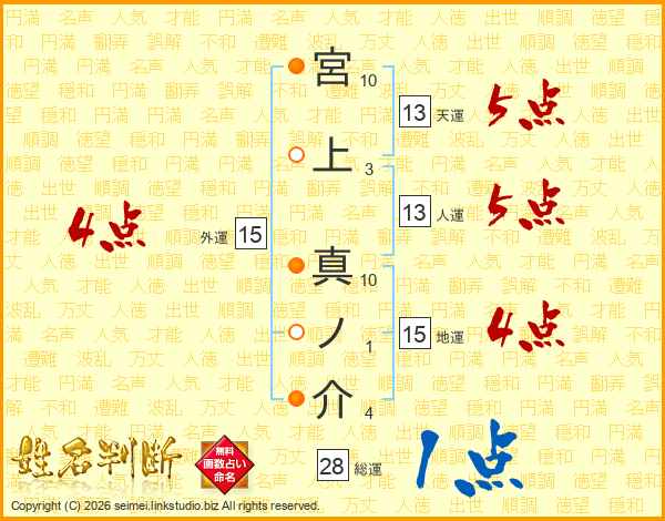 宮(10画)上(3画) 真(10画)ノ(1画)介(4画)