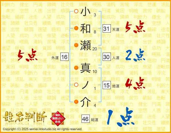小(3画)和(8画)瀬(20画) 真(10画)ノ(1画)介(4画)