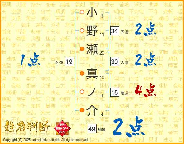 小(3画)野(11画)瀬(20画) 真(10画)ノ(1画)介(4画)