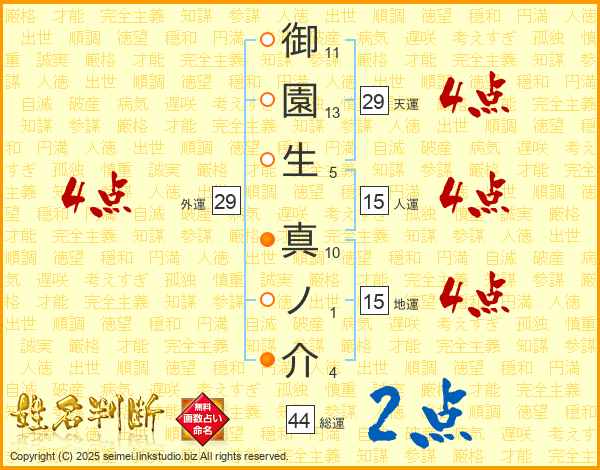 御(11画)園(13画)生(5画) 真(10画)ノ(1画)介(4画)
