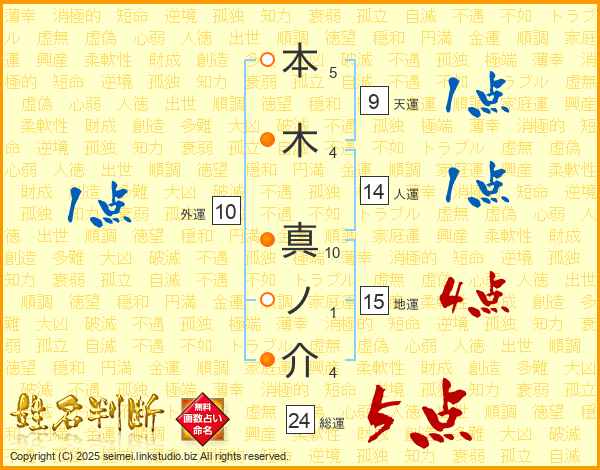 本(5画)木(4画) 真(10画)ノ(1画)介(4画)