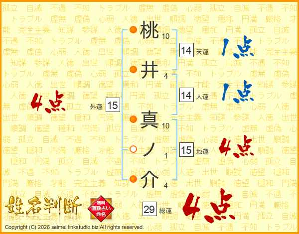 桃(10画)井(4画) 真(10画)ノ(1画)介(4画)