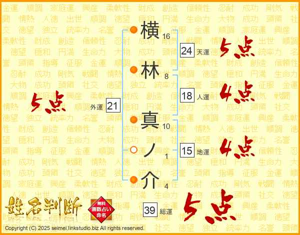横(16画)林(8画) 真(10画)ノ(1画)介(4画)