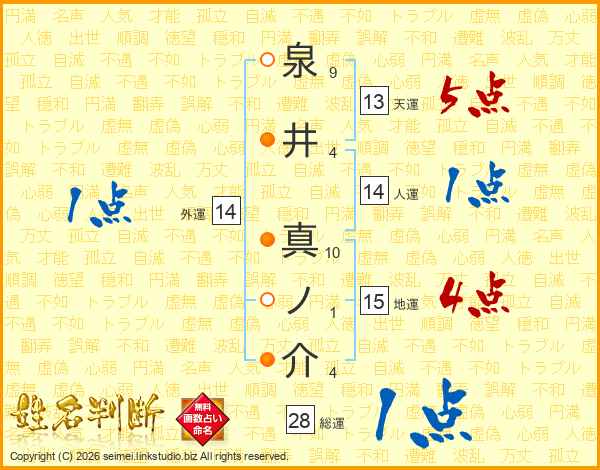 泉(9画)井(4画) 真(10画)ノ(1画)介(4画)