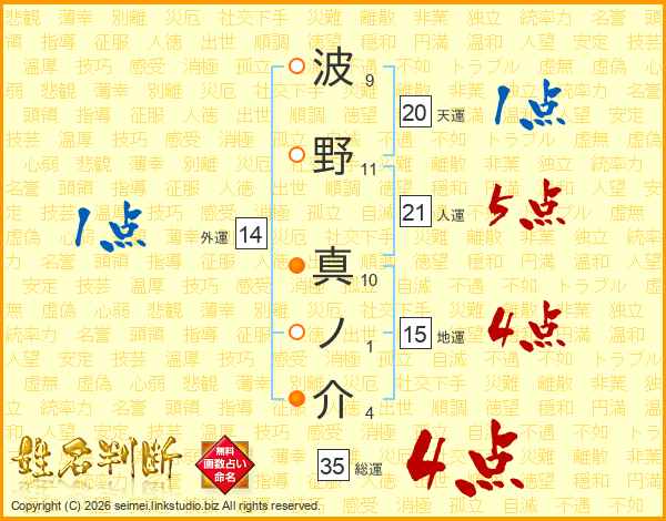 波(9画)野(11画) 真(10画)ノ(1画)介(4画)
