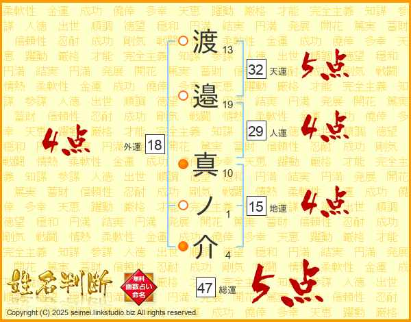 渡(13画)邉(19画) 真(10画)ノ(1画)介(4画)
