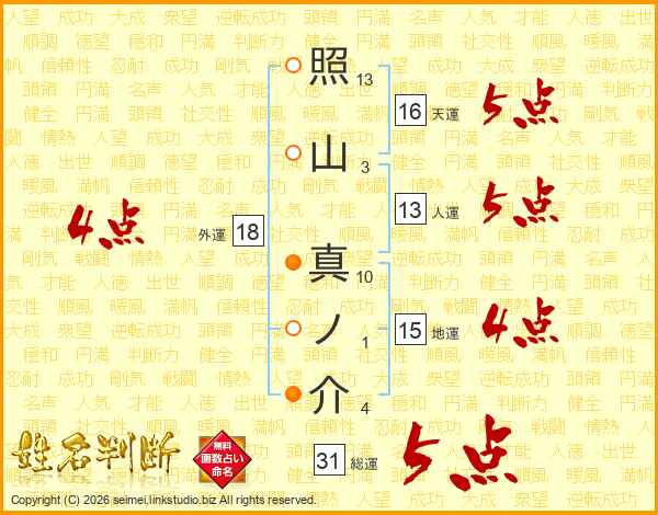 照(13画)山(3画) 真(10画)ノ(1画)介(4画)