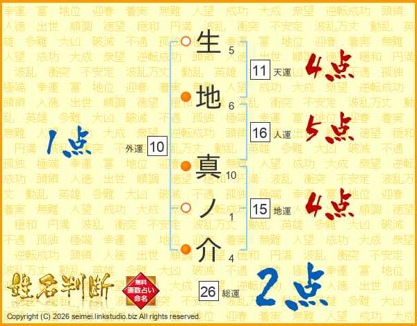 生(5画)地(6画) 真(10画)ノ(1画)介(4画)