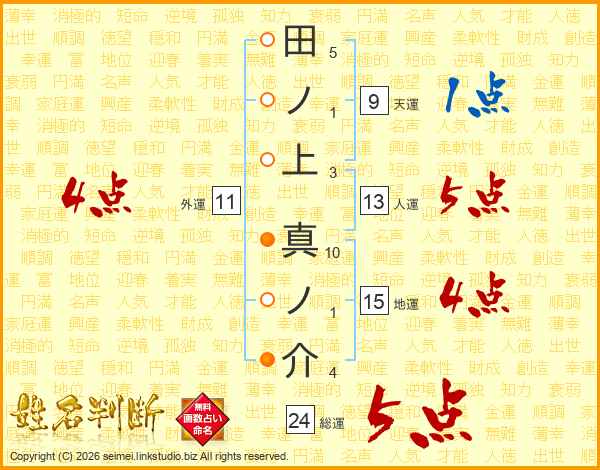 田(5画)ノ(1画)上(3画) 真(10画)ノ(1画)介(4画)