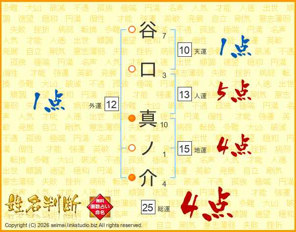 谷(7画)口(3画) 真(10画)ノ(1画)介(4画)