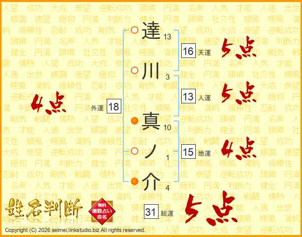 達(13画)川(3画) 真(10画)ノ(1画)介(4画)