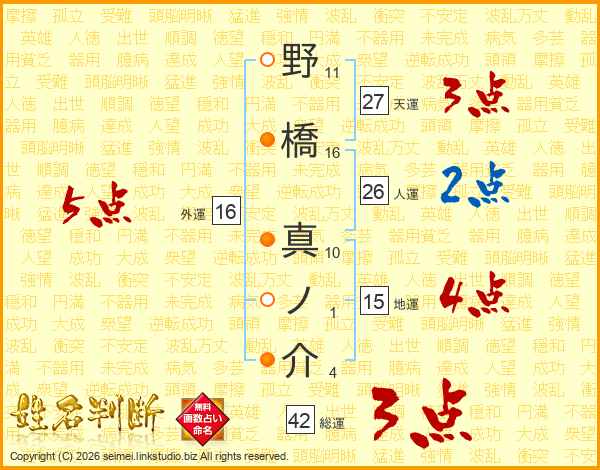 野(11画)橋(16画) 真(10画)ノ(1画)介(4画)
