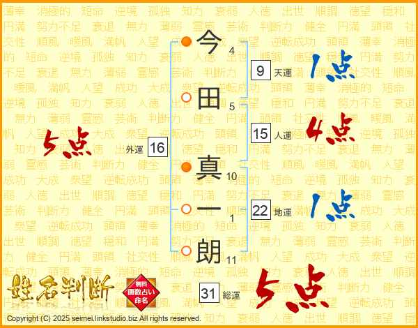 今(4画)田(5画) 真(10画)一(1画)朗(11画)
