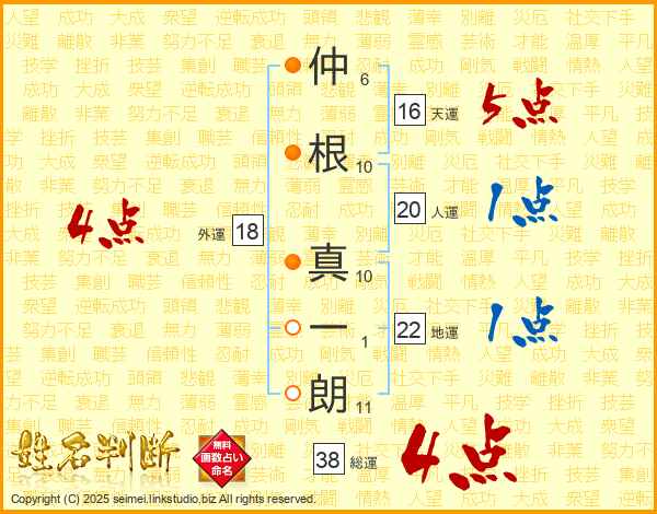仲(6画)根(10画) 真(10画)一(1画)朗(11画)