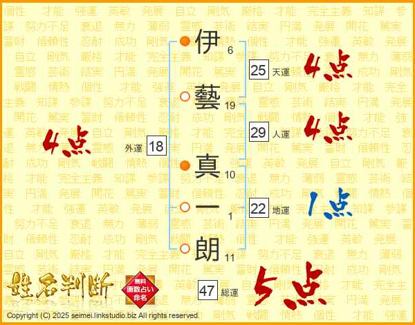 伊(6画)藝(19画) 真(10画)一(1画)朗(11画)