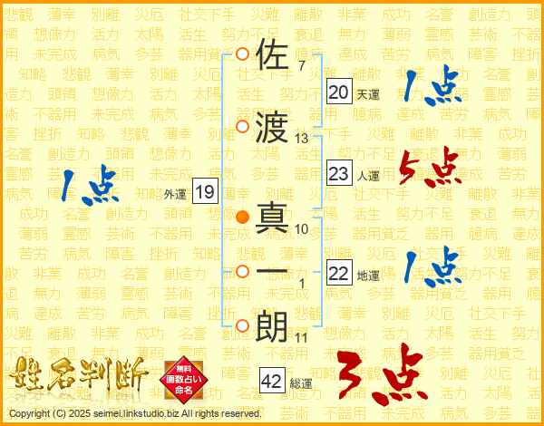 佐(7画)渡(13画) 真(10画)一(1画)朗(11画)