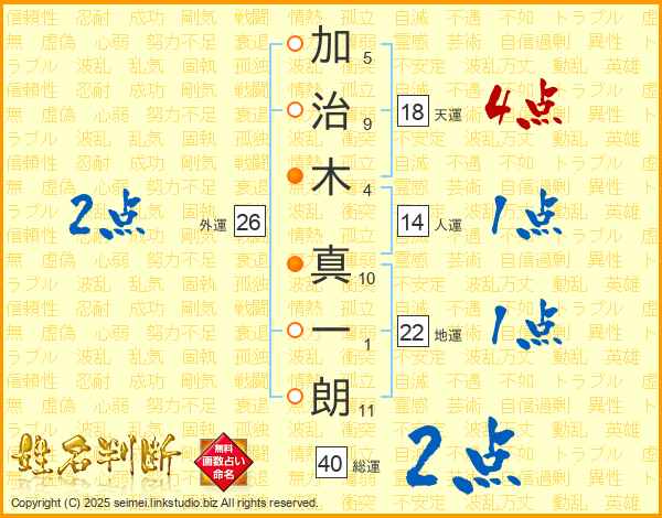 加(5画)治(9画)木(4画) 真(10画)一(1画)朗(11画)