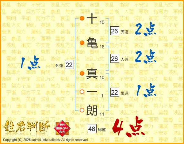 十(10画)亀(16画) 真(10画)一(1画)朗(11画)
