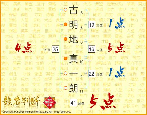 古(5画)明(8画)地(6画) 真(10画)一(1画)朗(11画)