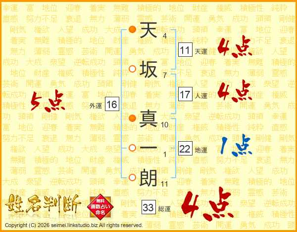 天(4画)坂(7画) 真(10画)一(1画)朗(11画)