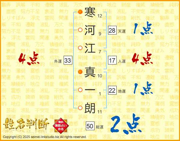 生活面を象徴する運勢です。外部から受ける影響力を表し、結婚運、家庭運や職場、環境への順応性を表します。総運から人運を引いた画数。姓や名が1文字の場合を除く。