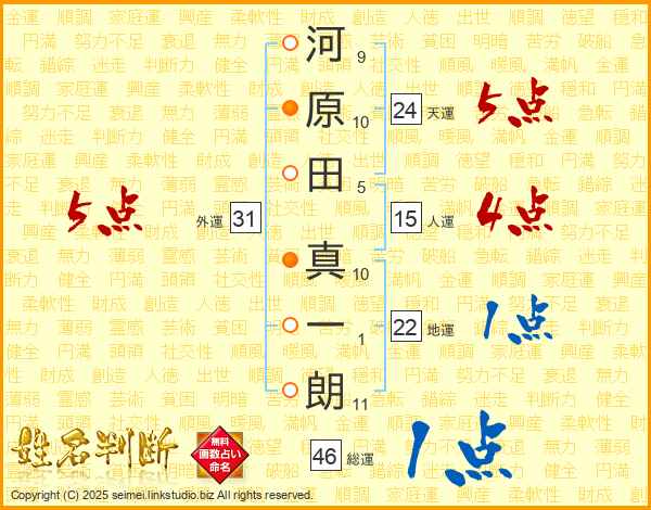 河(9画)原(10画)田(5画) 真(10画)一(1画)朗(11画)
