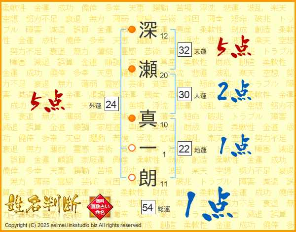 深(12画)瀬(20画) 真(10画)一(1画)朗(11画)