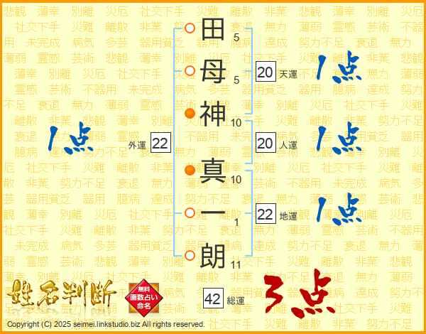 田(5画)母(5画)神(10画) 真(10画)一(1画)朗(11画)