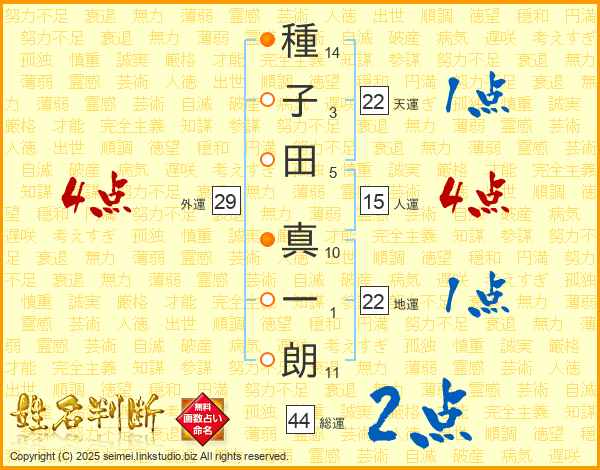種(14画)子(3画)田(5画) 真(10画)一(1画)朗(11画)