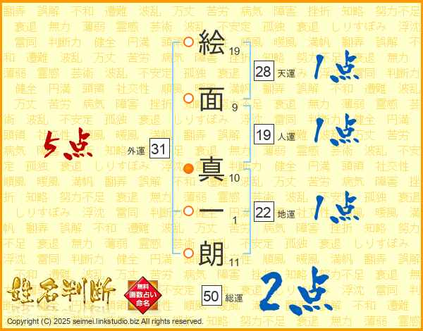 絵(19画)面(9画) 真(10画)一(1画)朗(11画)