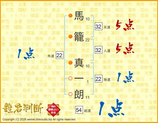 馬(10画)籠(22画) 真(10画)一(1画)朗(11画)