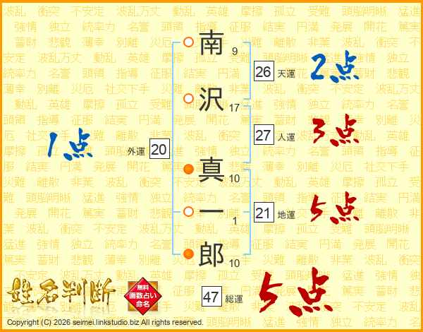 南(9画)沢(17画) 真(10画)一(1画)郎(10画)