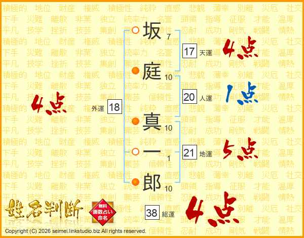 坂庭真一郎さんの総運は38画の4点!
