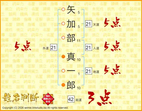 矢(5画)加(5画)部(11画) 真(10画)一(1画)郎(10画)