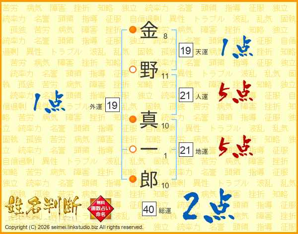 金(8画)野(11画) 真(10画)一(1画)郎(10画)