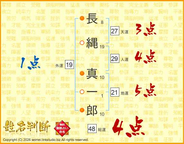 長(8画)縄(19画) 真(10画)一(1画)郎(10画)
