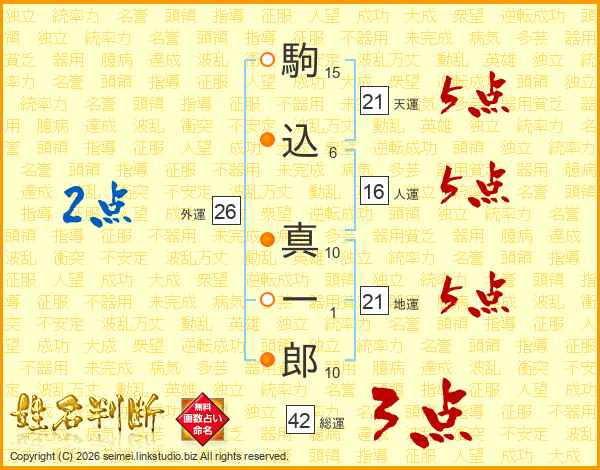駒(15画)込(6画) 真(10画)一(1画)郎(10画)