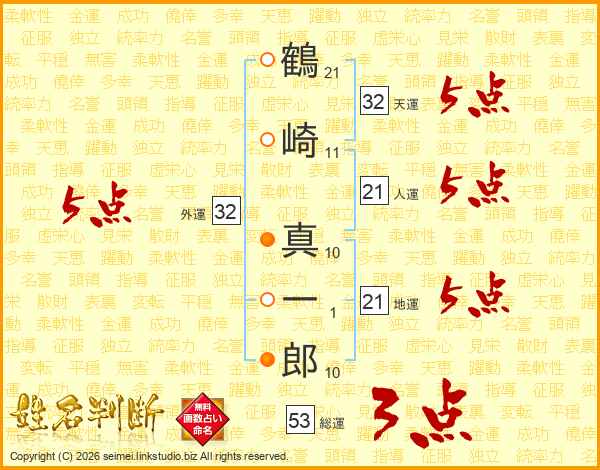 鶴(21画)崎(11画) 真(10画)一(1画)郎(10画)