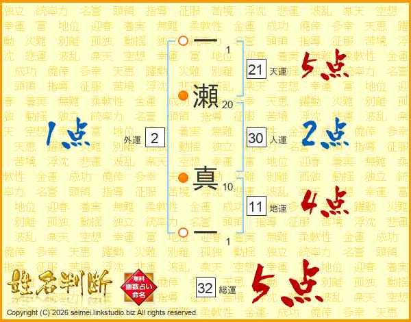 あなたの人生を表す1番重要な運勢です。生涯を通じて影響する総合運となり、主に50歳以降の晩年期に影響を及ぼします。苗字と名前の合計画数。