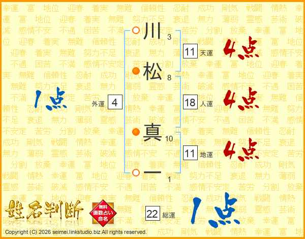 生活面を象徴する運勢です。外部から受ける影響力を表し、結婚運、家庭運や職場、環境への順応性を表します。総運から人運を引いた画数。姓や名が1文字の場合を除く。