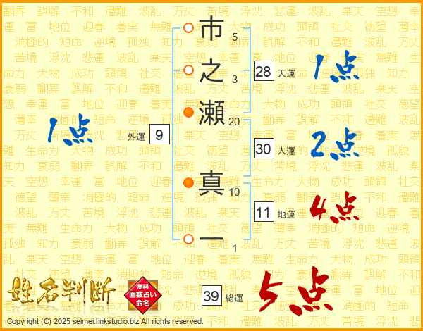 市(5画)之(3画)瀬(20画) 真(10画)一(1画)