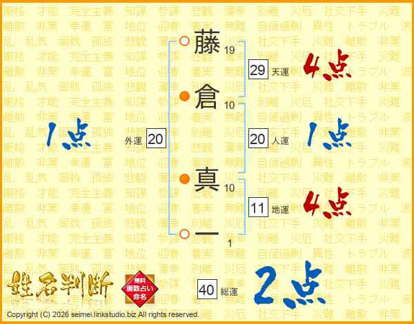 生活面を象徴する運勢です。外部から受ける影響力を表し、結婚運、家庭運や職場、環境への順応性を表します。総運から人運を引いた画数。姓や名が1文字の場合を除く。