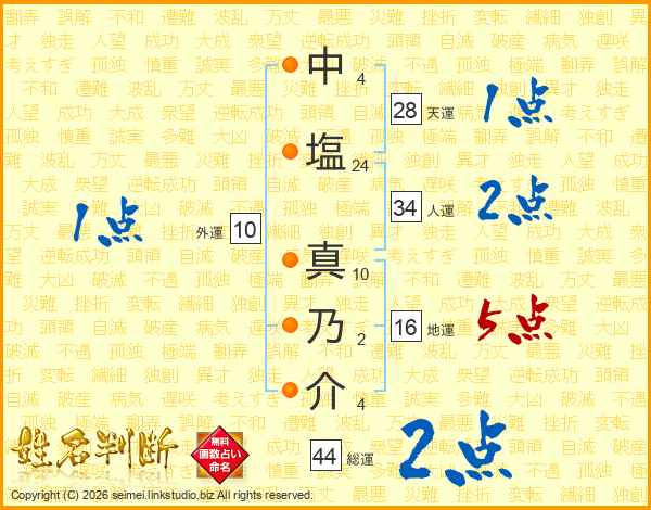 中(4画)塩(24画) 真(10画)乃(2画)介(4画)